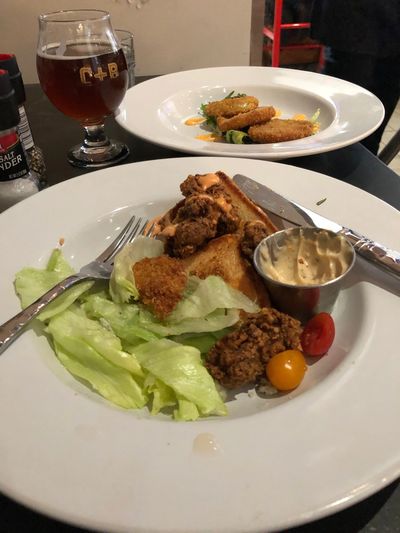 Bite, chew, sip, repeat. The Oysters were briny and the recommended beer complemented them perfectly. The green tomatoes were perfection and I washed everything down with the beer. It was a nice way to pass the time while I waited for my flight, which was delayed until 8 that eve. Comfort food, beer, wine and spirits. Couldn't ask for a better evening!